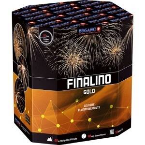 Feuerwerksbatterie Finalino Gold mit 18 Schuss, 57 mm Kaliber und 45 Sekunden Brenndauer. Kugelbomben-Buketts mit unterschiedlichen Gold- und Silber..