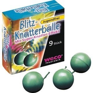 Schächtelchen mit 9 Knatterbällen. Erzeugt kräftigen Knatter-Effekt mit aufleuchtenden Blitzen.